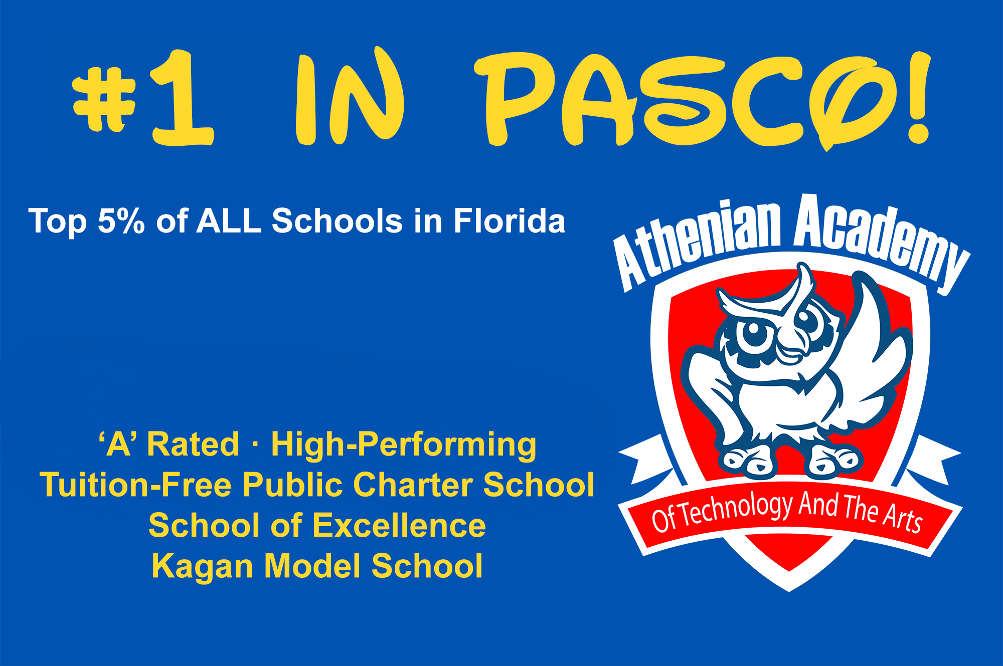 Athenian Academy of Technology and the Arts is the top school in Pasco County. We are ranked #1 out of all Pasco County elementary, middle, and high schools, including public and charter schools. We are committed to providing an exceptional educational experience for our families and team. As an ‘A’ rated, high-performing, tuition-free public charter school, Athenian Academy offers an incredible adventure for your child. We are proud to be one of only four schools nationally recognized as a Kagan Model School, and we have also been designated a School of Excellence by the Florida Department of Education, recognizing us as one of the top schools in Florida over the past three years. In addition, our performing arts program is frequently invited to perform at Walt Disney World. Since opening our doors in August 2006, we have served students from Trinity, New Port Richey, Port Richey, Holiday, Hudson, Odessa, Tarpon Springs, Palm Harbor, and Spring Hill.